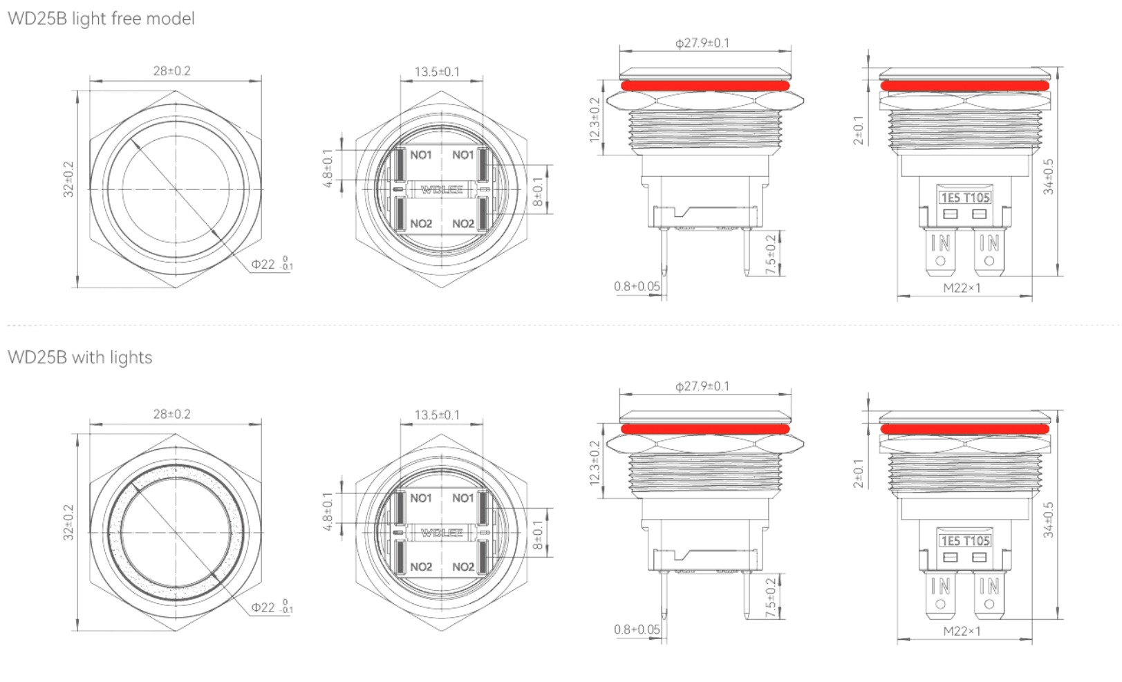 •             WD22D-G2-E-□□-S Металлические кнопочные переключатели высокого тока WD22D-G2-E-□□-S