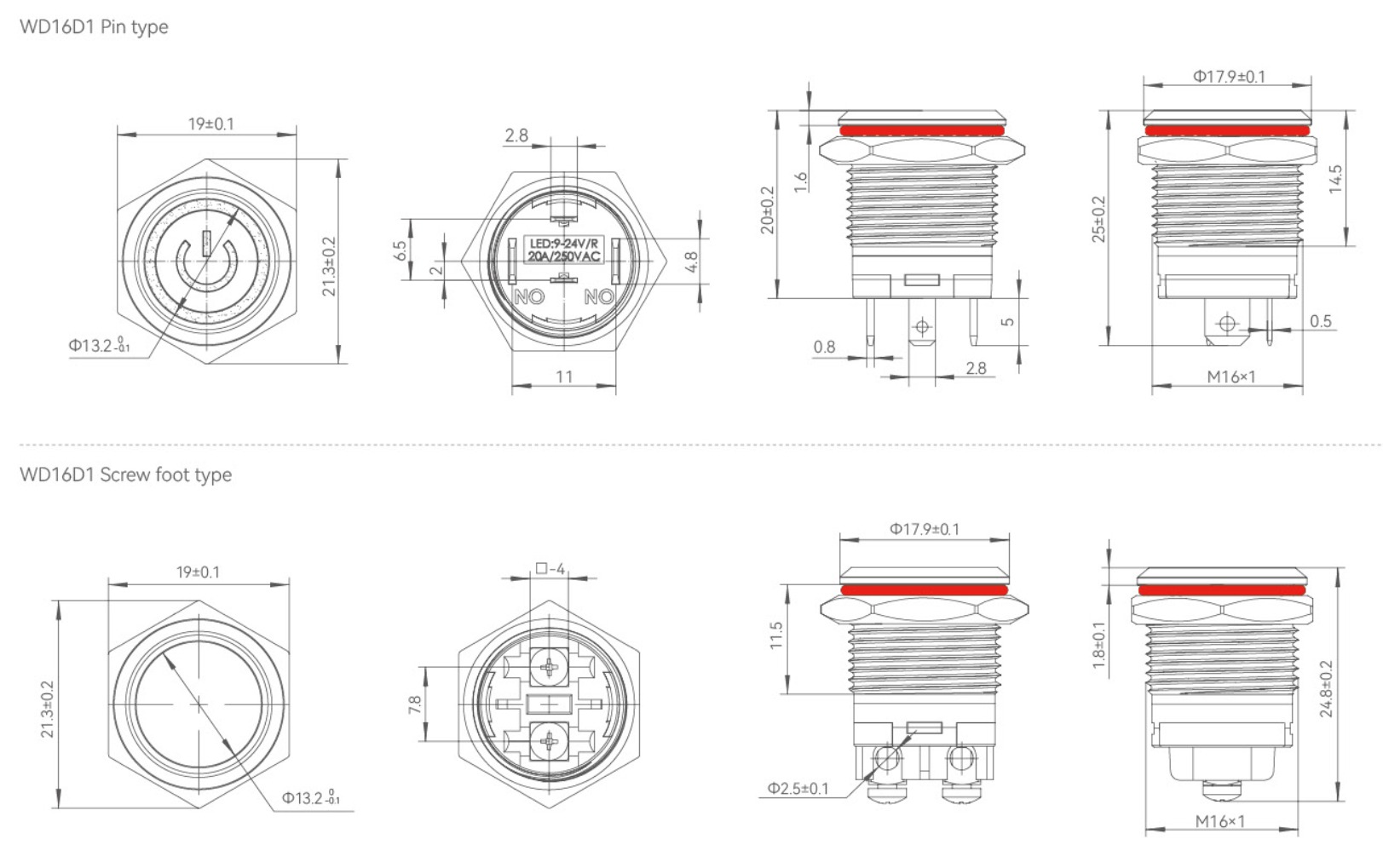 •             WD16D1-G1-E-□□-S Металлические кнопочные переключатели высокого тока WD16D1-G1-E-□□-S