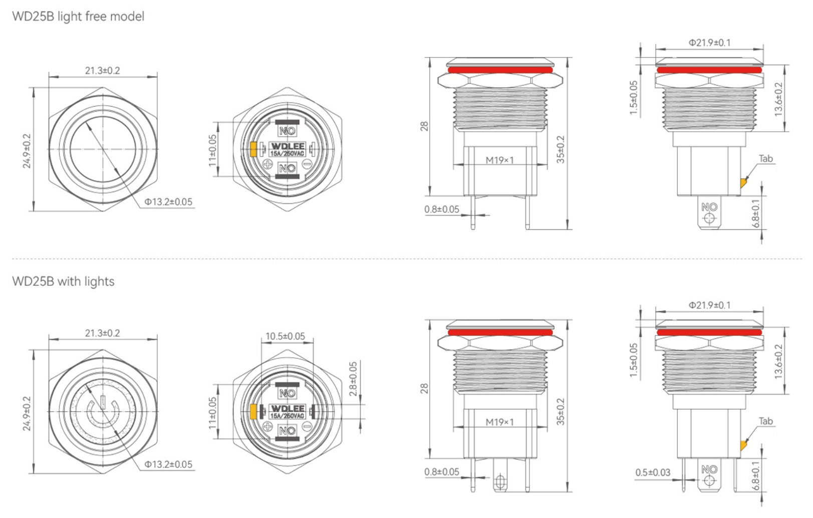 •             WD19D-P1-EC-□□-S Металлические кнопочные переключатели высокого тока WD19D-P1-EC-□□-S