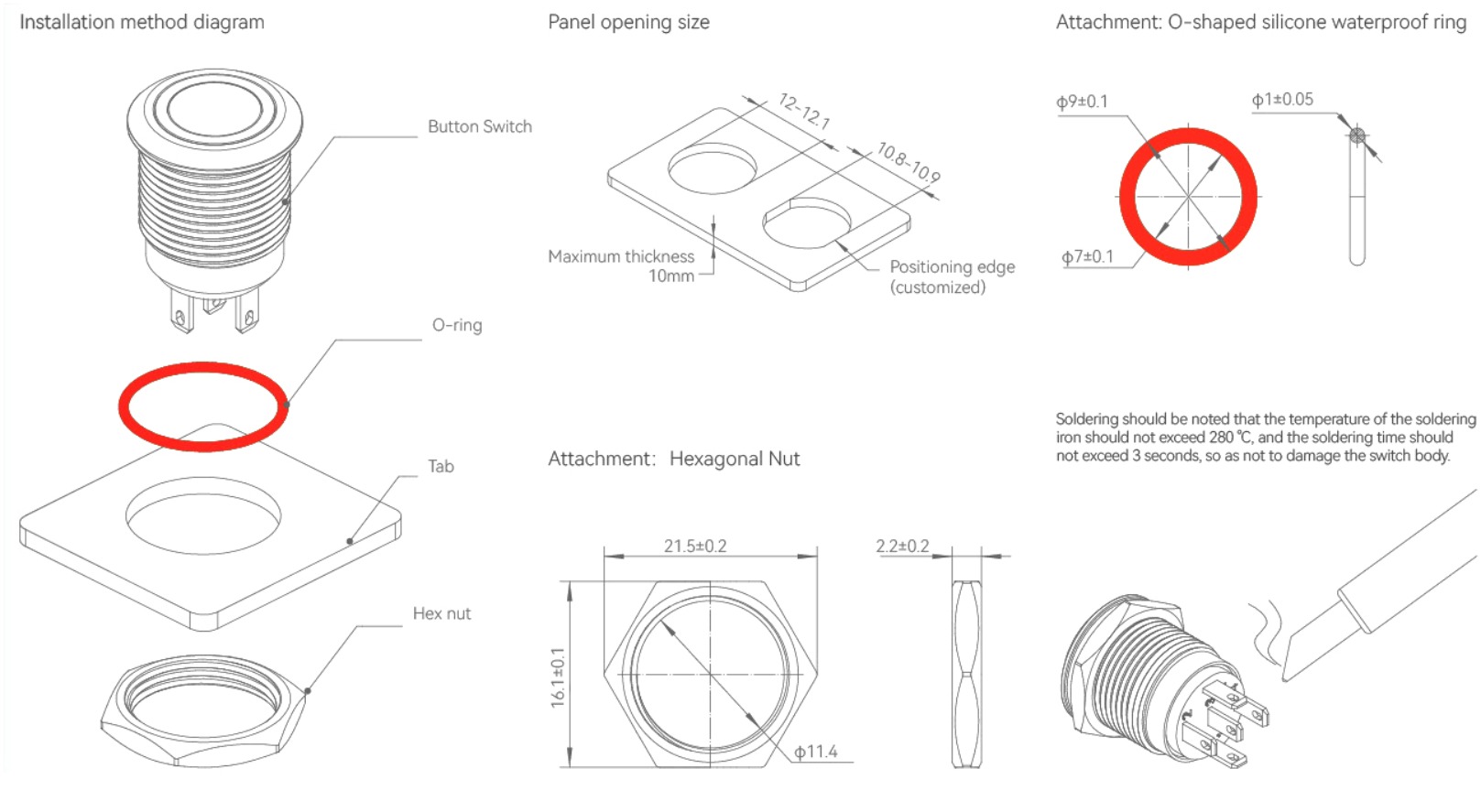Эта 12-миллиметровая кнопка, специально разработанная для использования в автомобилях, имеет водонепроницаемость (стандарт IP65, опционально до IP67/IP68), чтобы выдерживать воздействие воды, пыли и вибрации, типичных для транспортных средств. Его конструкция с подсветкой — доступная в вариантах с одним, двухцветным или многоцветным светодиодом — обеспечивает четкую обратную связь даже в условиях низкой освещенности или в кабине пилота. Металлическая конструкция устойчива к коррозии и повышает визуальную привлекательность, а утолщенные серебряные точки контактов и позолоченные контакты обеспечивают электрические характеристики при коммутационных нагрузках.