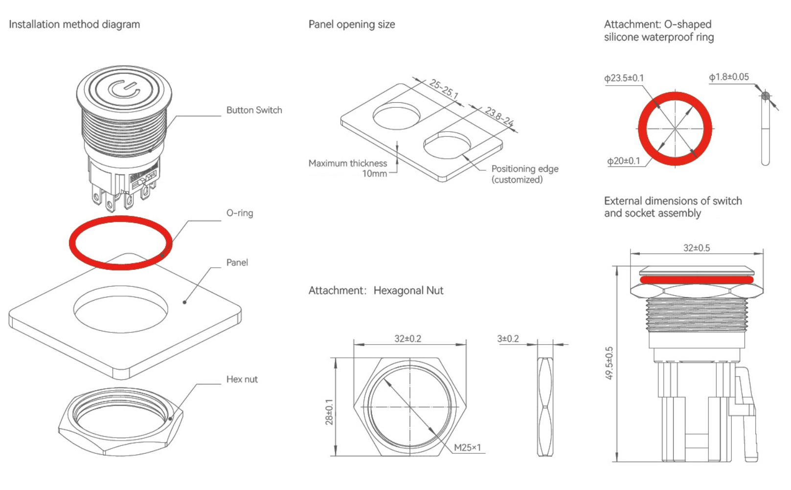 • 25 мм 1NO1NC Самоблокирующийся кнопочный переключатель