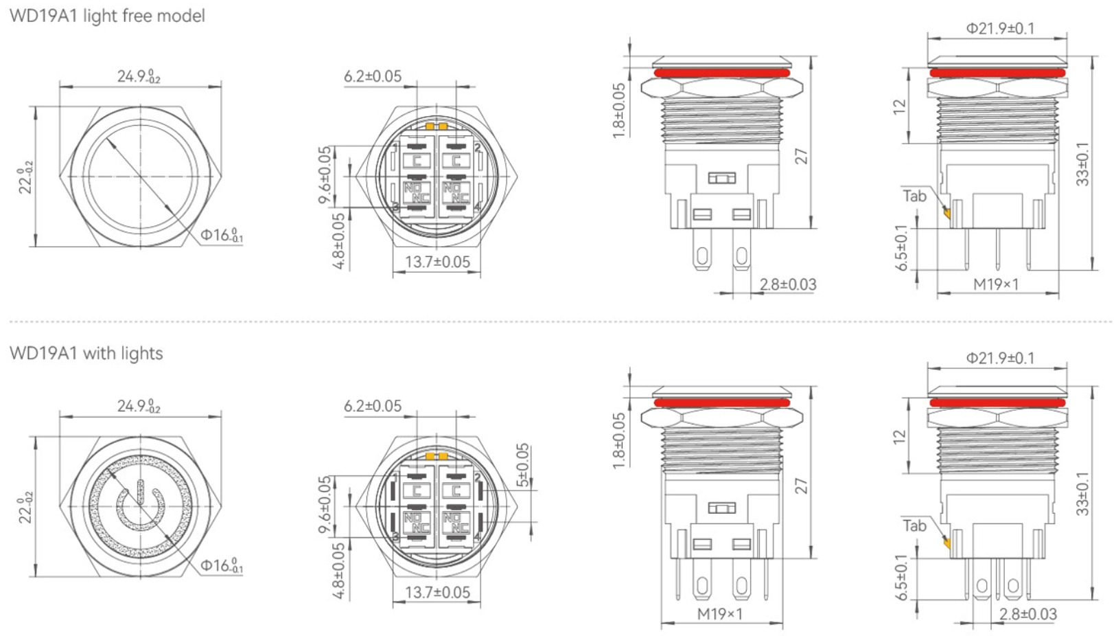 •             WD19A1-P22-C-□□-A Металлические кнопочные переключатели WD19A1-P22-C-□□-A